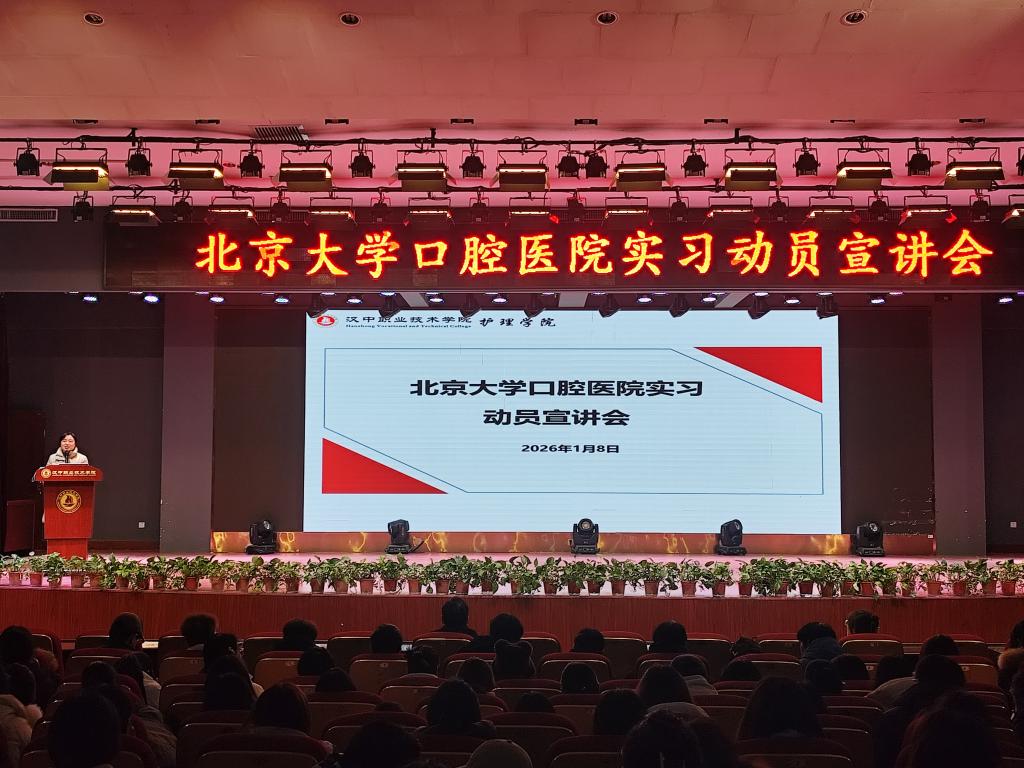 2026年1月8日,护理学院在行政楼多功能报告厅召开北京大学口腔医院实习动员宣讲会。护理学院党政领导、口腔护理班班主任及200余名2027届护理专业学生参加会议,会议由护理学院院长霍枚玫主持。